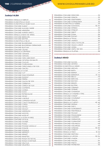 780 / CUPRINS PRIM%u0102RII WWW.GHIDULPRIMARIILOR.ROJude%u021bul ALBAPRIM%u00c3RIA ORA%u0218ULUI ABRUD.............................................................19PRIM%u00c3RIA MUNICIPIULUI AIUD.........................................................19PRIM%u00c3RIA MUNICIPIULUI ALBA IULIA..........................................19PRIM%u00c3RIA COMUNEI ALBAC ...............................................................19PRIM%u00c3RIA COMUNEI ALMA%u0218U MARE ...........................................19PRIM%u00c3RIA COMUNEI ARIE%u0218ENI.........................................................19PRIM%u00c3RIA COMUNEI AVRAM IANCU............................................20PRIM%u00c3RIA ORA%u0218ULUI BAIA DE ARIE%u0218..........................................20PRIM%u00c3RIA COMUNEI BERGHIN........................................................20PRIM%u00c3RIA COMUNEI BISTRA..............................................................20PRIM%u00c3RIA MUNICIPIULUI BLAJ........................................................20PRIM%u00c3RIA COMUNEI BLANDIANA .................................................20PRIM%u00c3RIA COMUNEI BUCERDEA GR%u00c2NOAS%u00c3......................20PRIM%u00c3RIA COMUNEI BUCIUM............................................................21PRIM%u00c3RIA COMUNEI C%u00c2LNIC..............................................................21PRIM%u00c3RIA ORA%u0218ULUI C%u00c2MPENI........................................................21PRIM%u00c3RIA COMUNEI CENADE...........................................................21PRIM%u00c3RIA COMUNEI CERG%u00c3U...........................................................21PRIM%u00c3RIA COMUNEI CERU-B%u00c3C%u00c3IN%u021aI .........................................21PRIM%u00c3RIA COMUNEI CETATEA DE BALT%u00c3 .................................21PRIM%u00c3RIA COMUNEI CIUGUD...........................................................22PRIM%u00c3RIA COMUNEI CIURULEASA................................................22PRIM%u00c3RIA COMUNEI CR%u00c3CIUNELU DE JOS............................22PRIM%u00c3RIA COMUNEI CRIC%u00c3U............................................................22PRIM%u00c3RIA ORA%u0218ULUI CUGIR..............................................................22PRIM%u00c3RIA COMUNEI CUT.....................................................................22PRIM%u00c3RIA COMUNEI DAIA ROM%u00c2N%u00c3...........................................22PRIM%u00c3RIA COMUNEI DO%u0218TAT............................................................22PRIM%u00c3RIA COMUNEI F%u00c3R%u00c3U..............................................................23PRIM%u00c3RIA COMUNEI GALDA DE JOS...........................................23PRIM%u00c3RIA COMUNEI G%u00c2RBOVA.......................................................24PRIM%u00c3RIA COMUNEI G%u00c2RDA DE SUS..........................................23PRIM%u00c3RIA COMUNEI HOP%u00c2RTA.......................................................24PRIM%u00c3RIA COMUNEI HOREA.............................................................24PRIM%u00c3RIA COMUNEI IGHIU.................................................................25PRIM%u00c3RIA COMUNEI %u00ceNTREGALDE ...............................................26PRIM%u00c3RIA COMUNEI JIDVEI ...............................................................26PRIM%u00c3RIA COMUNEI LIVEZILE..........................................................26PRIM%u00c3RIA COMUNEI LOPADEA NOU%u00c3.......................................27PRIM%u00c3RIA COMUNEI LUNCA MURE%u0218ULUI ...............................27PRIM%u00c3RIA COMUNEI LUP%u0218A...............................................................27PRIM%u00c3RIA COMUNEI METE%u0218 ..............................................................27PRIM%u00c3RIA COMUNEI MIHAL%u021a.............................................................27PRIM%u00c3RIA COMUNEI MIR%u00c3SL%u00c3U .....................................................28PRIM%u00c3RIA COMUNEI MOGO%u0218............................................................28PRIM%u00c3RIA COMUNEI NO%u0218LAC...........................................................28PRIM%u00c3RIA ORA%u0218ULUI OCNA MURE%u0218............................................28PRIM%u00c3RIA COMUNEI OCOLI%u0218.............................................................28PRIM%u00c3RIA COMUNEI OHABA.............................................................28PRIM%u00c3RIA COMUNEI PIANU...............................................................28PRIM%u00c3RIA COMUNEI POIANA VADULUI....................................29PRIM%u00c3RIA COMUNEI PONOR ............................................................29PRIM%u00c3RIA COMUNEI PO%u0218AGA ...........................................................31PRIM%u00c3RIA COMUNEI R%u00c3DE%u0218TI...........................................................31PRIM%u00c3RIA COMUNEI R%u00c2ME%u021a..............................................................32PRIM%u00c3RIA COMUNEI RIMETEA.........................................................32PRIM%u00c3RIA COMUNEI RO%u0218IA DE SECA%u0218.......................................32PRIM%u00c3RIA COMUNEI RO%u0218IA MONTAN%u00c3.....................................32PRIM%u00c3RIA COMUNEI S%u00c3LCIUA..........................................................32PRIM%u00c3RIA COMUNEI S%u00c3LI%u0218TEA ........................................................32PRIM%u00c3RIA COMUNEI S%u00c3SCIORI........................................................32PRIM%u00c3RIA COMUNEI S%u00c2NCEL ...........................................................32PRIM%u00c3RIA COMUNEI S%u00c2NTIMBRU .................................................33PRIM%u00c3RIA COMUNEI SC%u00c3RI%u0218OARA ...............................................35PRIM%u00c3RIA MUNICIPIULUI SEBE%u0218 ....................................................33PRIM%u00c3RIA COMUNEI SOHODOL.............................................